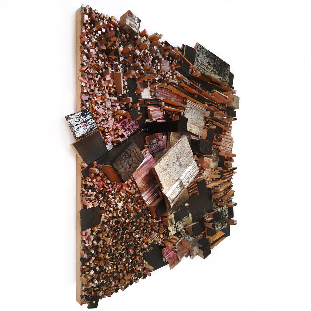 Medium: acrylic, ink & silver leaf on wood, charred wood, graphite powderSize: 1080 x 1110 x 210mm